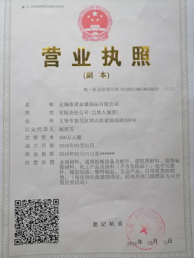 » 無錫緣諾金屬制品有限公司 »資質證書